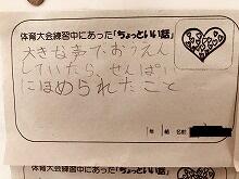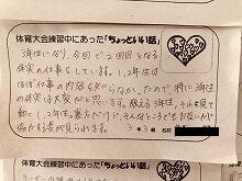 生徒会の発案で体育大会練習中の「ちょっといい話」を全校生徒に募集したところ、本当にたくさんの応募がありました。これまでの練習の中で「全力」で「見えないところ」で「さりげなく」仲間をサポートしている人がたくさん紹介されています。応募用紙には、「あなたが先輩・後輩、仲間とのつながりの中で、感じる嬉しい気持ちや、自分の心にしまっておくだけではもったいない見た・聞いた・体験した『ちょっといい話をぜひ教えてください」と書かれています。生徒会の発案も素晴らしいし、それに応えて書く生徒たちも素晴らしいです。