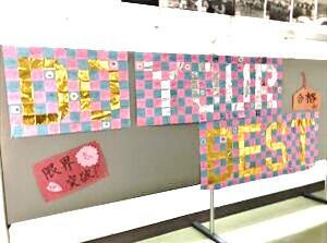 3年教室につながる階段の風景です。(太宰府の破魔矢もあります)