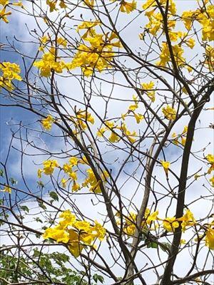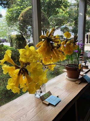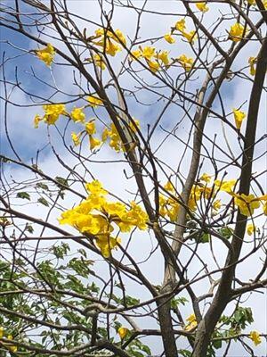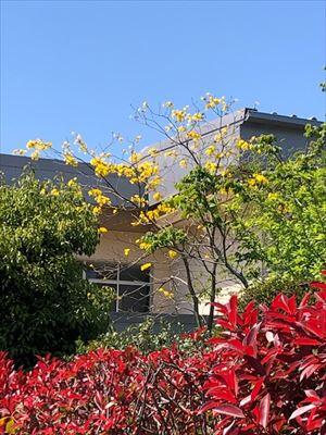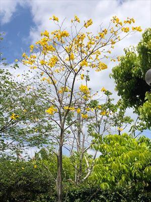 東中北棟の玄関前には、高くそびえるイペーの木(ブラジル原産)があり、濃い黄色の鮮やかな花をたくさん咲かせています。