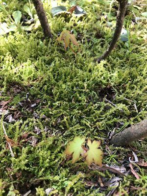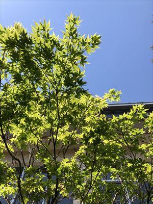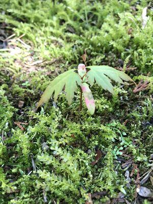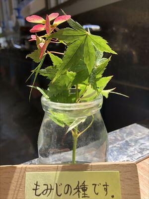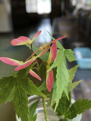 東中の中庭には、もみじ(紅葉)の木が1本あり、新緑の美しい葉を輝かせています。その葉先から舞い落ちたもみじの種が、地面に着床してかわいい「もみじの子ども」が育っています。