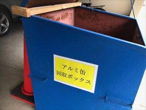 東中では年間を通して、常時アルミ缶を回収しています。武道場下と西門付近の2か所に青色ボックス(写真)を設置して、いつでも入れてもらうことができます。年末年始も可能です。