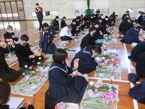 19日(金)に3年生はフラワーアレンジメントを行いました。みやざき花で彩る未来推進協議会による「花育の出前講座」の一環として実施されました。