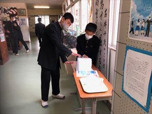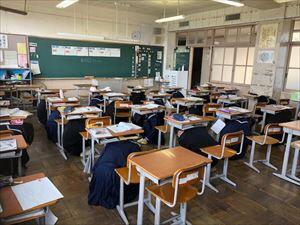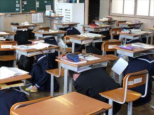3月11日は10年前に東日本大震災が発生した日です。高鍋町ではこの日を「学校防災の日」としており、東中では予告なしで午前8時19分に緊急地震警報を流して、避難訓練を行いました。どの学年・学級も、先生の指示なしでも、生徒全員が落ち着いて机の下に避難していました。
