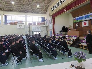 今日、高鍋東中学校 第78回 入学式が行われました。先輩たちが見守る中、99名の新入生が入場してきました。やはり緊張からか、新入生のみんなの顔は少しこわばっていたように思います。それでも大きな声で返事をしたり、返礼をしたりしながら、しっかりした態度で式に臨む姿は、既に立派な東中生でした。これで全校生徒336名がそろいました。明日からの学校生活を頑張ってくれることと思います。