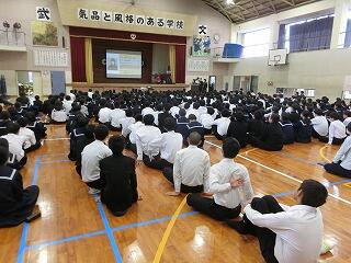 午後、ふるさと講話が行われました。高鍋町在住の観光ボランティア、臼山様を講師にお招きして、郷土出身の名君「上杉鷹山」について全校生徒で学習しました。本当に凄い方だったんだなあと改めて思いました。みんな、メモを取りながら一生懸命に聞き入っていました。