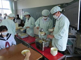 今日は、全校生徒がそろった本格スタート第1日目でした。給食スタートの日、そして、新入生お祝い給食でもありましたので、今日は、1年生の給食に注目してみました。みんな協力して頑張っていました。ご覧ください。