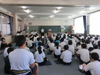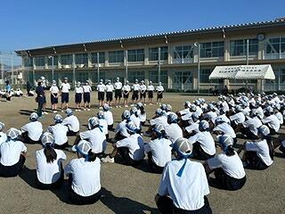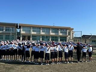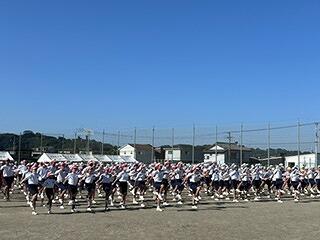 1,2時間目、全校生徒が運動場に集い、体育大会に向けた第1回全体練習が実施されました。空は、どこまでも澄み渡っていて、少し暑かったですが、とても気持ちよかったです。そんな中、行進の練習に始まり、開会式の流れの確認、団別活動等を行いました。3年生を中心にみんなよく声も出ていて、最高のスタートを切ることができました。少しずつ青、赤、黄の各団の対抗心も出てきています。これからが楽しみです。