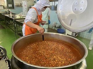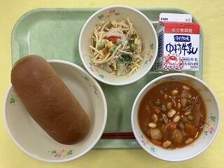 今日の給食は、黒糖パン、ポークビーンズ、冷菜パスタサラダ、牛乳 でした。今日は、週1回のパンの日。みんなの大好きな黒糖パンでした。教室では、先生の「おかず、増やしてほしい人!」の呼びかけに何人も集まっていました。たくさん食べて、元気を出してください。