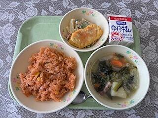 今日の給食は、チキンライス、白菜スープ、オムレツ、マカロニサラダ、牛乳 でした。今日は、クリスマスメニュー第1弾。チキンライスの上にオムレツをのせて開くと、オムライスに変身! 卵とケチャップの組み合わせで、とてもおいしくいただきました。