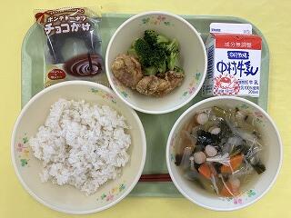 2学期最後の給食は、クリスマス献立第2弾。麦ご飯、コンソメスープ、鶏肉のスパイス揚げ、ブロッコリーのレモン和え、クリスマスデザート、牛乳 でした。子どもたちみんなが大好きな鶏のから揚げは、スパイスが効いていて一段とおいしかったです。デザートもついて、最高の給食でした。今年一年間、おいしい給食をありがとうございました。