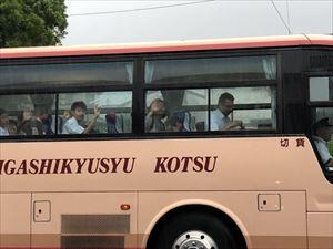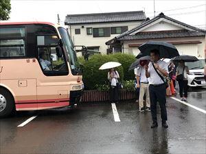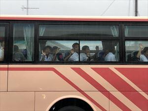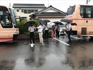 7月1日(月)5時50分、2年生(修学旅行)が町中央公民館前から小倉駅(北九州市)に向かってバス3台で出発しました。