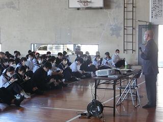午後、ふるさと講話が行われました。高鍋町在住の観光ボランティア、臼山様を講師にお招きして、郷土出身の名君「上杉鷹山」について全校生徒で学習しました。本当に凄い方だったんだなあと改めて思いました。みんな、メモを取りながら一生懸命に聞き入っていました。