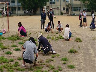アルミ缶回収終了後7時40分からは、引き続きPTA親子奉仕作業が行われました。今年は、グランドの側溝の蓋を開け中の土を全てあげました。グランドの整備とあわせて、たくさんの保護者や生徒の皆さんが頑張ってくれました。また、岩切建設様、坂本水道様ご協力ありがとうございました。