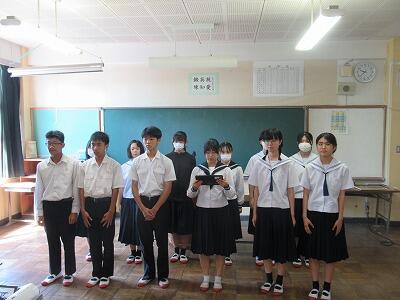 【2年代表】私は今のクラス組が大好きです。道徳の授業で「全員に親友宣言」では、私は「親友」を「心の友」としました。心からの友なら耳の痛いことでも相手に伝わるはずです。また学年目標は「3年生を超えよう」です。パワフルで勢いがあるところは伸ばし、集中力、じっくり考える力などをつけ、3年生を超えるように頑張ります。【3年代表】2学期の目標の一つ目は、授業態度の改善と早めのテスト勉強です。授業中先生の話をしっかり聞くことはできていますが、僕は発表することが苦手です。自信をもって積極的に手を挙げるようにしたいです。二つ目は体力向上と健康です。3年生は部活動がないので、できるだけ運動して体力を落とさないように心がけたいです。また、食事は3食必ず取ることと手洗い、うがい、消毒、マスク着用を徹底したいです。