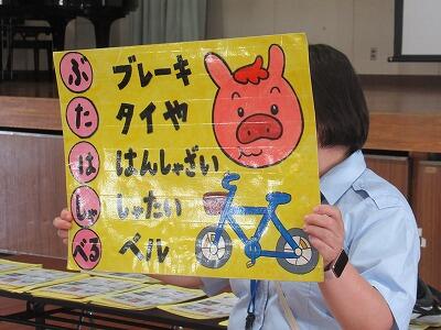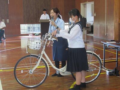 今日は体育館で、実際に自転車点検をしたり、映像を見て自転車乗車中の危険について話し合ったりしました。