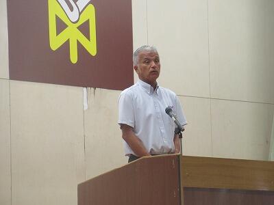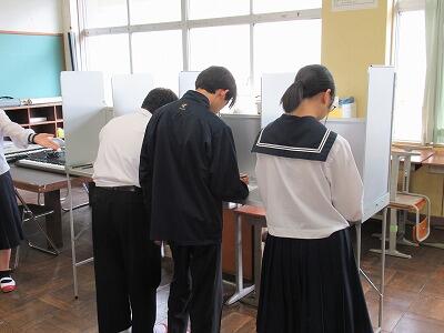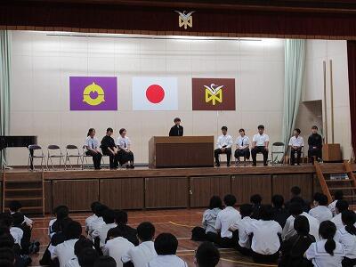 校長先生のお話、選挙管理委員長の話の後、現生徒会役員が見守る中、候補者が堂々と自分の意見を述べていました。