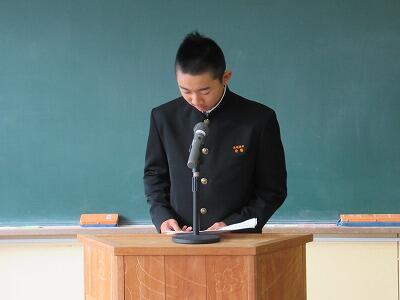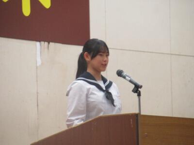 【生徒会代表】1・2年生の私たちは、次の学年に上がる準備をしなければなりません。まずは、何事にも全力で取り組むということです。生徒会スローガン「実践進虹」を意識して、学校生活をよりよくし、一人一人が大きく成長することができるように頑張りましょう。