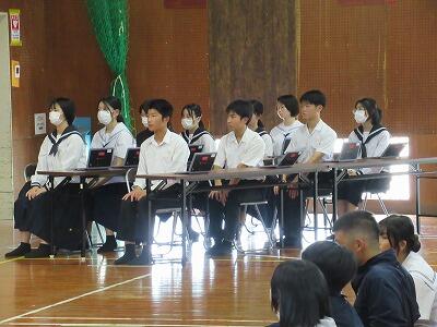 始業式では、代表生徒の作文発表、校長先生のお話、校歌斉唱、諸連絡、選挙管理委員会からの連絡、各種表彰を行いました。