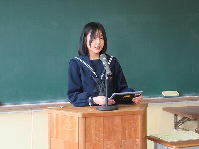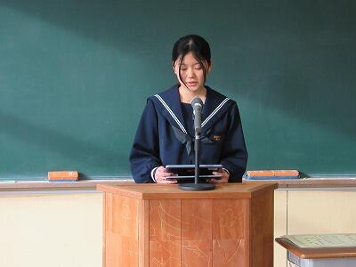 続いて終業式でした。1学年代表の森美咲さん、2年代表の浅川翔くん、3年代表の永田まどかさんがそれぞれ2学期を振り返り発表をしました。