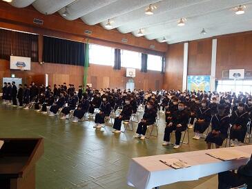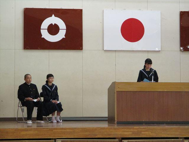 大清掃の後、修了式が行われました。今年の反省を1年代表・高橋玄くん、2年代表・黒川心夢くんが発表しました。4月になるとそれぞれが2年生、3年生になり新しい高鍋西中を背負っていきます。頑張ってください。