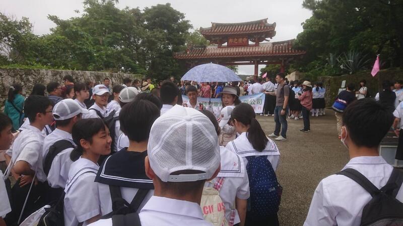 守礼門にて、ガイドさんから沖縄の歴史を学ぶ生徒達。