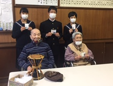 12月11日に、1年環境学習「廃材を利用したキーホルダー作り」で制作したキーホルダーの贈呈式を行いました。このキーホルダーは、11月27日の総合的な学習の時間に作ったもので、1年生の書いた手紙を添えて高齢者施設の方々にお渡ししました。また、当日の授業の様子はMRT「みらい・みやざき まなび隊」で、令和3年1月2日(土)午前11時15分~11時25分に放映予定です。