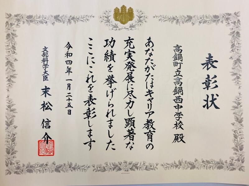令和4年1月25日に文部科学省・経済産業省・厚生労働省主催で開催された「令和3年度キャリア教育推進連携シンポジウム」において、高鍋西中学校が「キャリア教育優良学校」として文部科学大臣から表彰されました。本校の重点取組であるキャリア教育が高く評価されたことは誠に栄誉なことであり、保護者の皆様、高鍋町及び高鍋町教育委員会をはじめ学校をご支援いただいている皆様にお礼を申し上げます。また、総合的な学習の時間を中心に意欲的に諸活動に取り組んでいる高鍋西中生にとっても大きな励みになります。夢と希望に満ちた未来に向けてさらに邁進してほしいと思います。