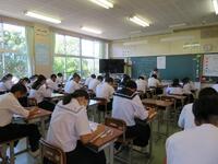 台風の進路が非常に気になるところです。さて、本日から明日までの予定で、3年生は実力テスト、1・2年生は定期テストが行われています。本日は、各学年とも3教科実施しました。手応えはいかがでしたか?明日まで計画されており、本日まで部活動も中止としていますので、残りの教科のテスト勉強を計画に行ってください。1・2年生においては、朝から冷房に不具合が生じ、終日冷房なしの生活でした。迷惑をおかけしました。