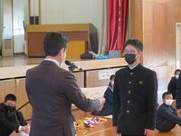 今朝は、大変冷たい風が吹きつける中の登校でした。また、県内でも雪による交通規制等が行われているところもあります。そんな中でしたが、本日、2学期の終業の日を無事迎えることができました。新型コロナウイルス感染症の感染を常に念頭においての日々でした。大きな感染拡大や生徒・職員の命に係わる事件・事故等もなく終えることができ、ホッとしております。終業式は、リモートにより実施いたしました。はじめに、漢字検定、英単語コンテスト、英語検定の表彰と年明けに行われる県市町村駅伝大会に中学男子の部に出場する3名の激励を行いました。そして、式では、各学年と生徒会の代表の皆さんが、2学期の反省を発表してくれました。どの生徒の発表も代表にふさわしい、内容、話し方に感心いたしました。明日から冬休みです。いつもより長め(17日間)の長期休業となり、この間に年末年始を迎えます。命を大切にし、有意義な休みにしてください。また、保護者の皆様や本校をご支援いただきましたすべての皆様に対しまして、感謝の意を表すると共に来年もどうぞ温かなご支援を賜りますようよろしくお願いいたします。2023年が、HPを見ていただいている皆様方にとって「幸多き、素晴らしい年でありますように」ご祈念申し上げす。よいお年をお迎えください。