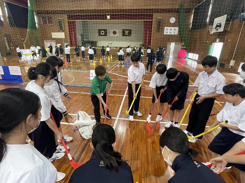 6月20日(木)、1年生の総合的な学習の時間では、高鍋町スポーツ推進員協議会と高鍋町レクリェーション協会の方々を講師にお招きし、「ニュースポーツ体験」を行いました。「ユニホック」「モルック」など初めて聞くスポーツばかりでした。みんな楽しそうに参加していました。