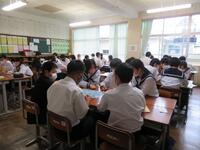 相変わらず雨の一日です。河川の増水や低い土地への浸水、土砂災害など本校の校区も十分注意を払う必要がある箇所があります。危機管理意識を高めておくことが必要です。どうぞよろしくお願いいたします。さて、本日の午後の総合的な学習の時間の一コマを紹介します。1年生は、これから頻繁に活用していくタブレット端末の更新作業でした。小学校から学習してきたものもしっかり残すためにも必要不可欠な作業となりました。2年生は、SDGsについて学習していくための最初の時間のようでした。グループになって理解を少しずつ深めていきました。3年生は、タブレット端末を使いながら三者面談の学習を行いました。あらかじめ与えられていた質問に対して、自分の考えをいかに、簡潔にわかりやすく、相手に伝えることができるかを学んでいました。