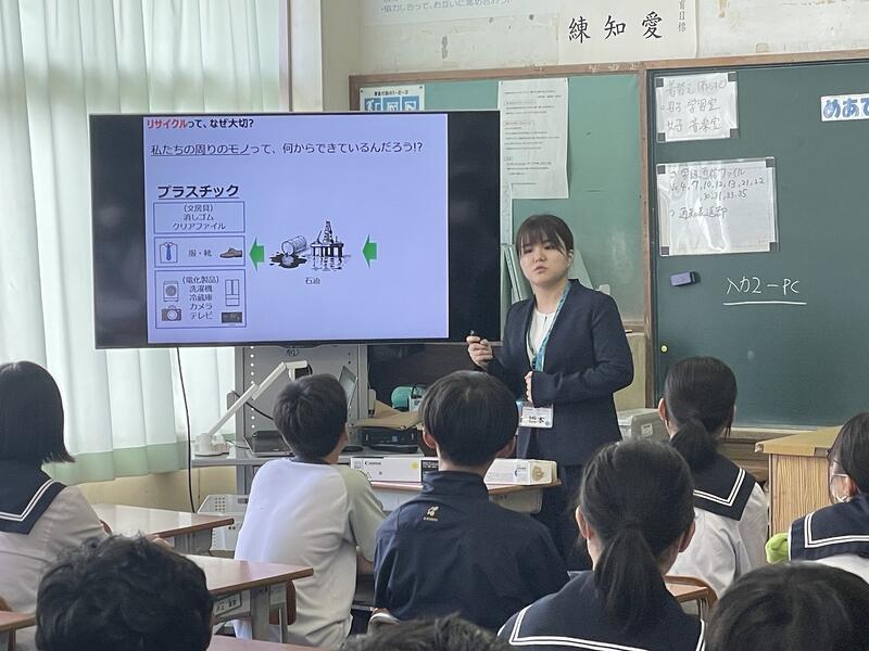 10月3日(木)2年の総合的な学習の時間で、高鍋町に工場がある宮崎キヤノン株式会社の方に来ていただき、SDGsの観点から、会社として製品のリサイクルをどのように取り組んでおられるのか、お話しいただきました。講話の後は班ごとに分かれて、回収された部品の分別の仕方を、簡単な器具を使って体験しました。