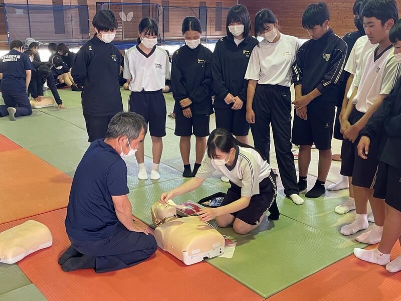 胸骨圧迫とAEDの使い方を学びました。みんな真剣なまなざしで聞いていました。