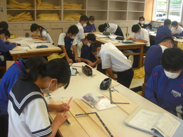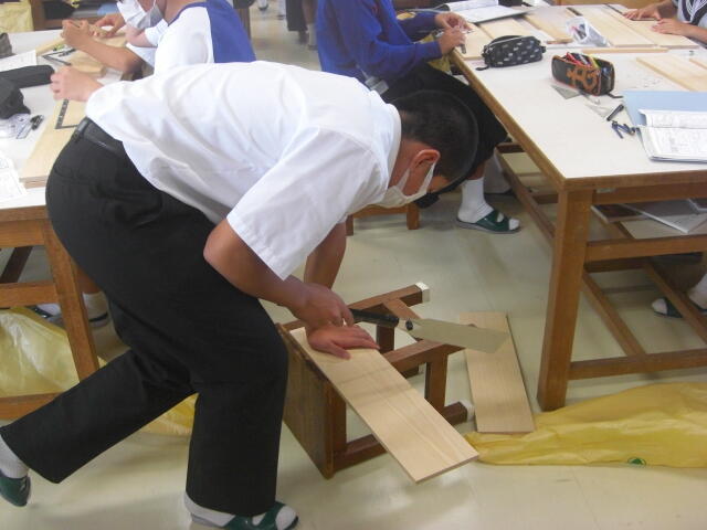 2年生が技術で木材加工の実習をしていました。のこぎりで切る作業に取りかかった生徒もいます。何ができるか、これからも楽しみです。