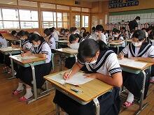 今日と明日、3年生は地区の実力テスト受けます。今回は、志望校・学科別の順位も出ます。今日は国語、理科、英語のテストがあり、登校後から教室で熱心に勉強している生徒もいました。明日は社会と数学のテストがあります。