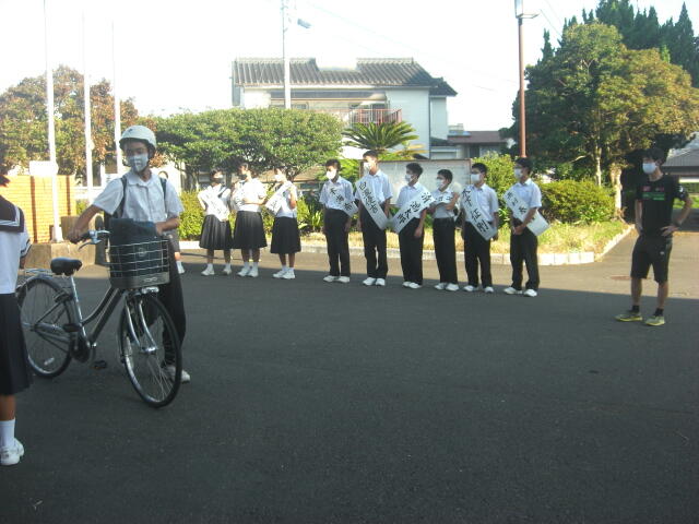 秋の交通安全運動に合わせて、町内の自転車屋さんが通学に使っている自転車の点検をしてくださいました。今日は朝から雨が降っていたため自転車で通学した生徒は少なかったのですが、点検の結果、どの自転車もただしく整備してありました。今日は新富町内の他の中学校でも点検がありました。生徒のために点検をしてくださりありがとうございました。