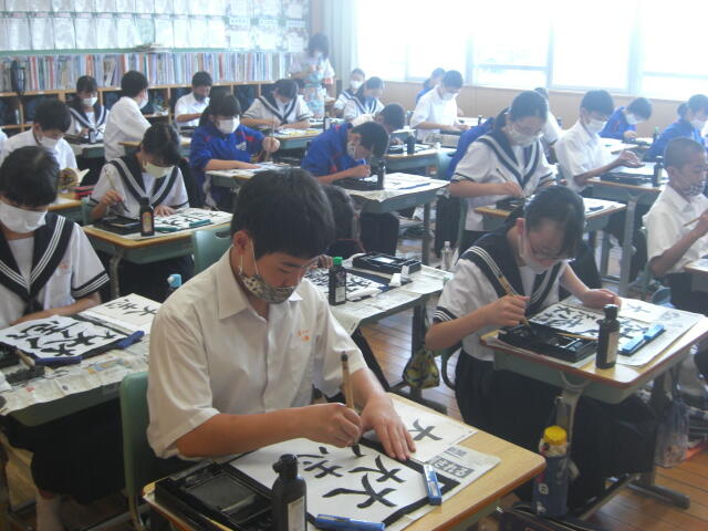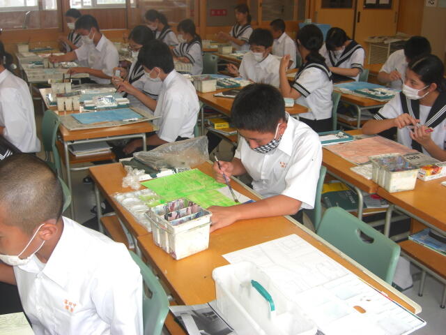水泳に備えてプール掃除が行われています。2校時は、2年2組と5組の生徒が一生懸命に掃除をしていました。高圧洗浄機も使いつつ少しずつきれいになります。美術室では、1年1組が「なぜか気になる情景」を描いていました。「どうして?何が?気になったのか」興味をそそられ、聴いてみたいところでしたが授業中ですので・・・。