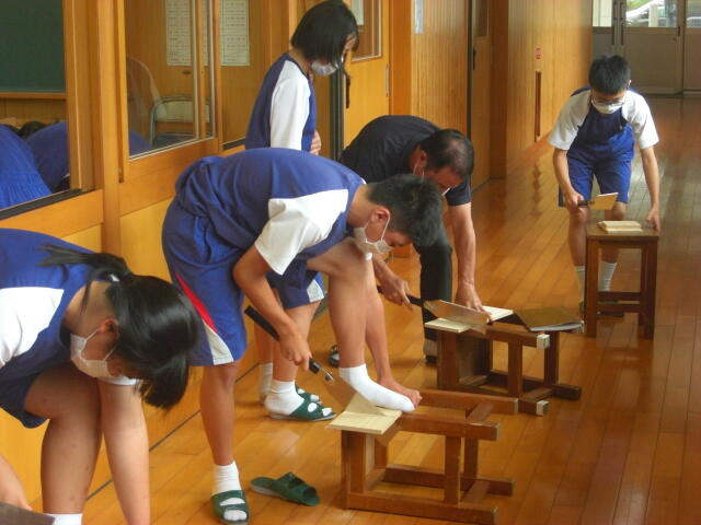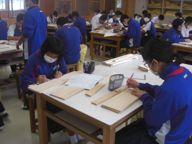 2年生が技術で木材加工の実習をしていました。のこぎりで切る作業に取りかかった生徒もいます。何ができるか、これからも楽しみです。