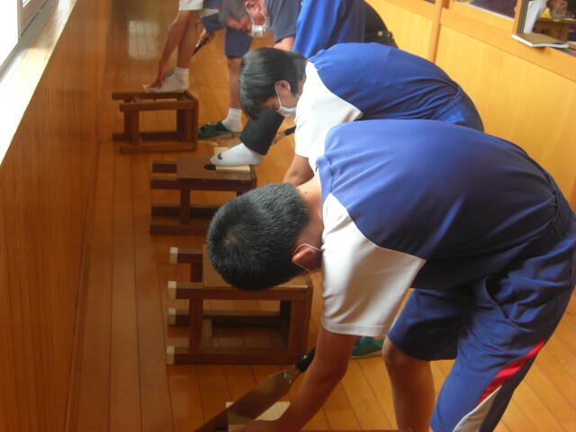 台風10号による被害が心配されましたが、これといったことはなく、順調に授業を行っています。ふだんは6校時のあとに清掃をしますが、今日は1校時の前に清掃をして授業に入りました。昨日、職員で片付けもしましたが、生徒自身できれいにすることも意義のあることだと思いました。富田中の生徒は、手際よく清掃をします。学校の自慢の1つです。