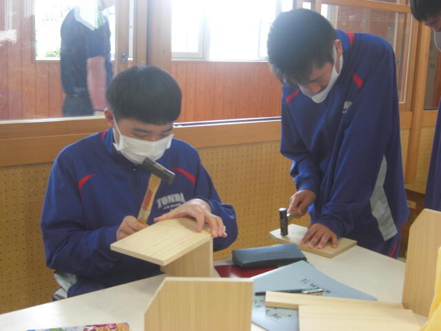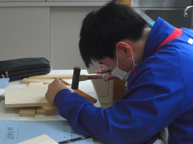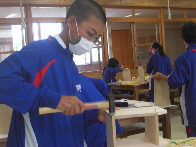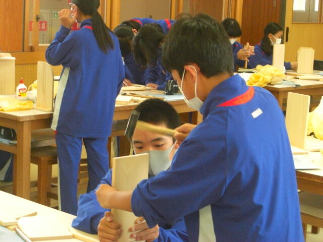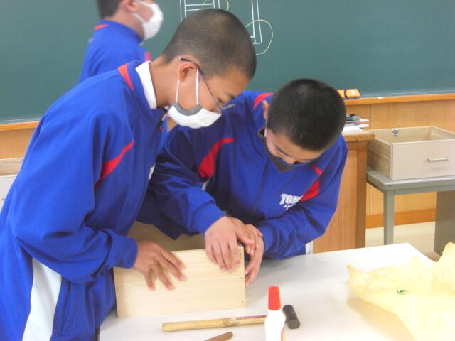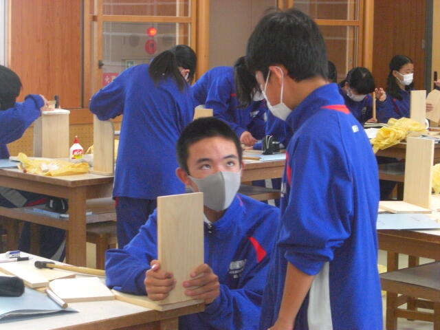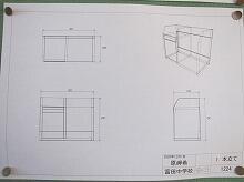 富田中の技術の授業では、1年のコンピュータの学習で、CADを利用し製図を描きます。そして2年生の木材加工では、自分で描いた製図をもとに本立てなどを製作します。