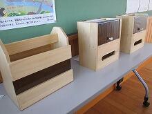 完成した作品は校内に展示し、一緒に製図も掲示してあります。物づくりの楽しみを味わいながら、設計から製作までの基本的な流れを体験しています。