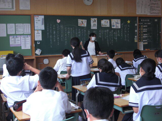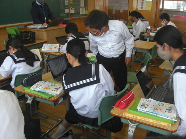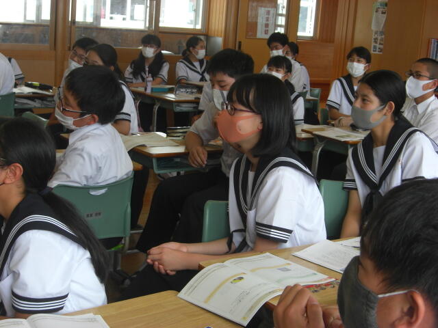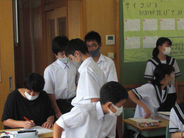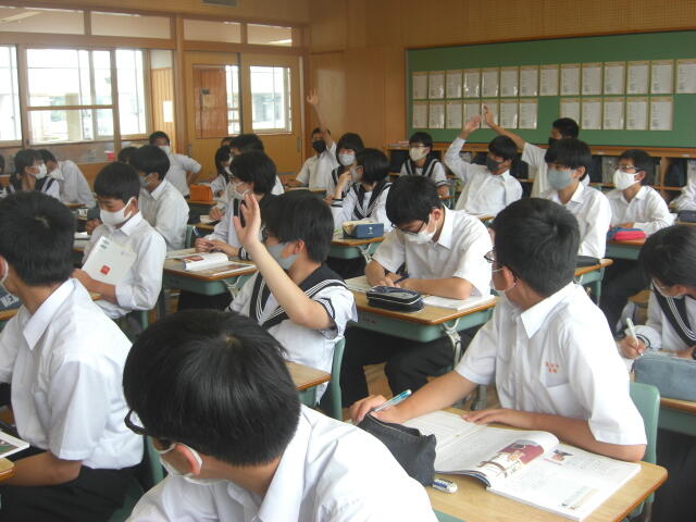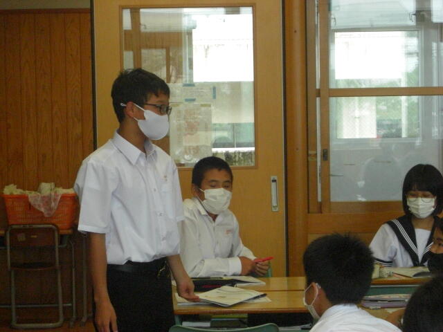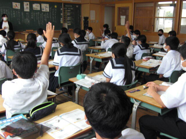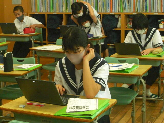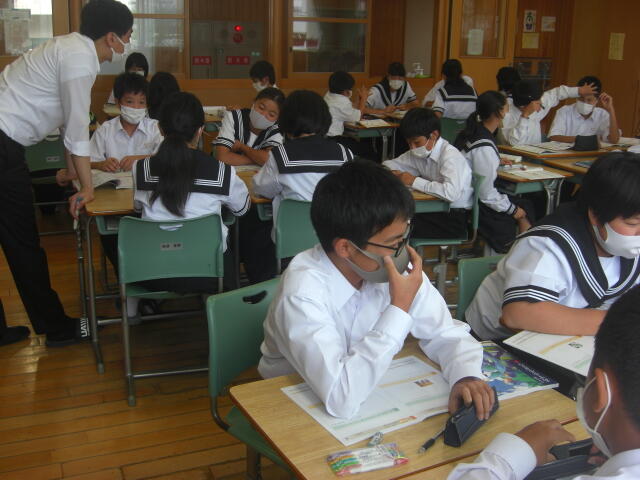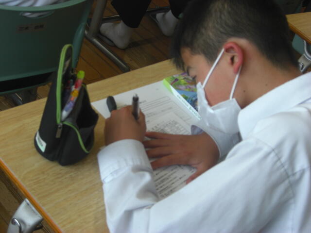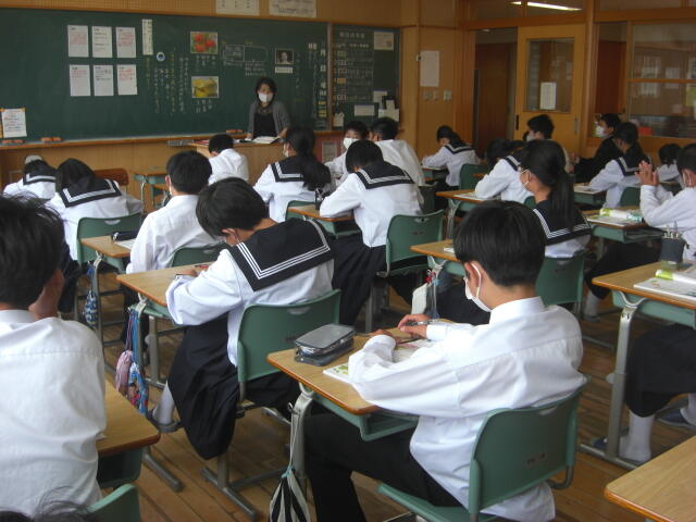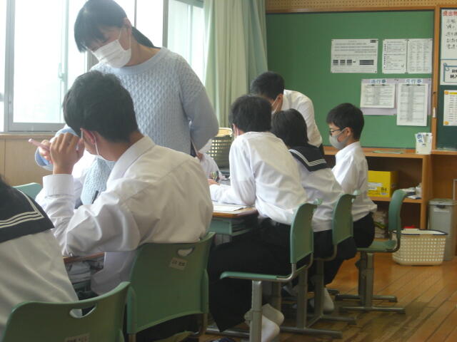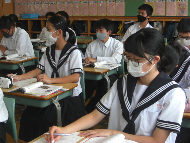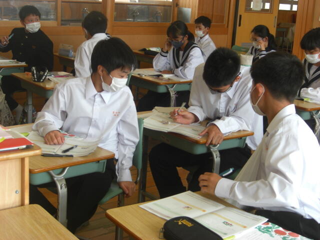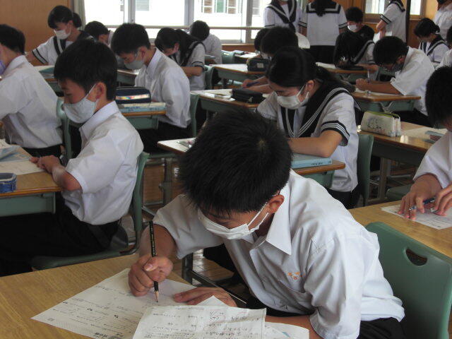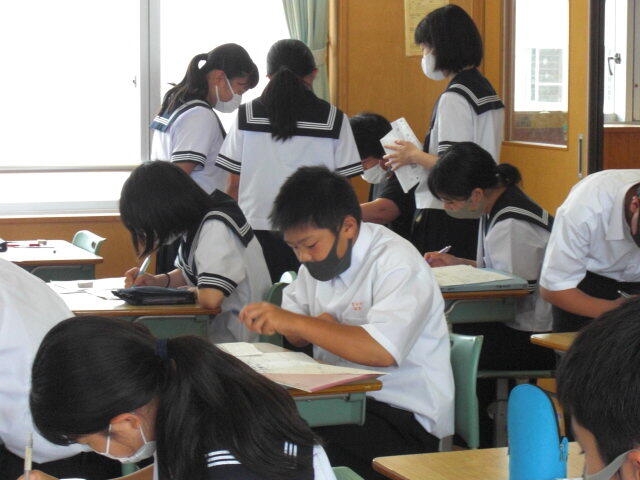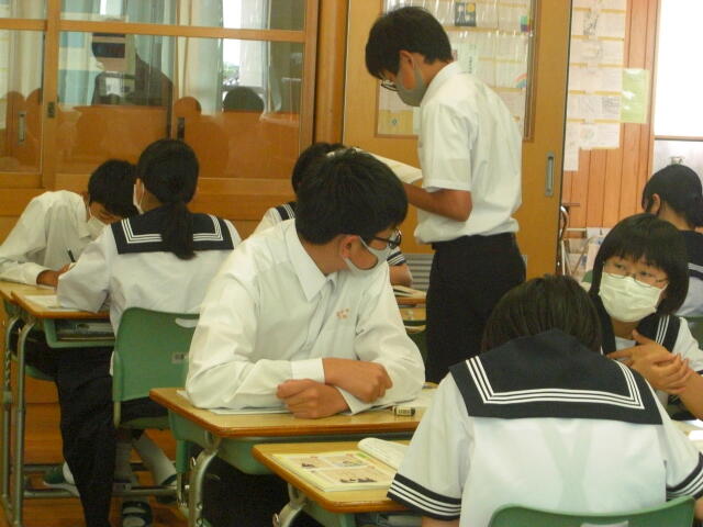 1・2年生は、23日(水)から期末テストですから、1週間前となりました。1年生にとっては、初めての定期テストです。1年3組の数学では、練習問題を速く正しく解くことを目標にして、みんなが一生懸命に問題に向き合っていました。本年度は、町教育委員会から特別支援教育支援員を配置していただいており、都合がつく場合には授業のサポート(ここでは、丸付け)もしてくださっています。