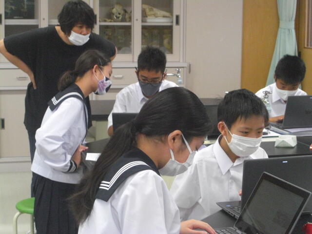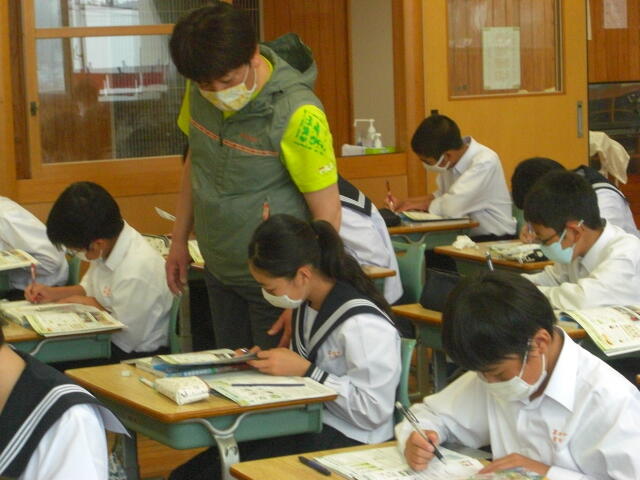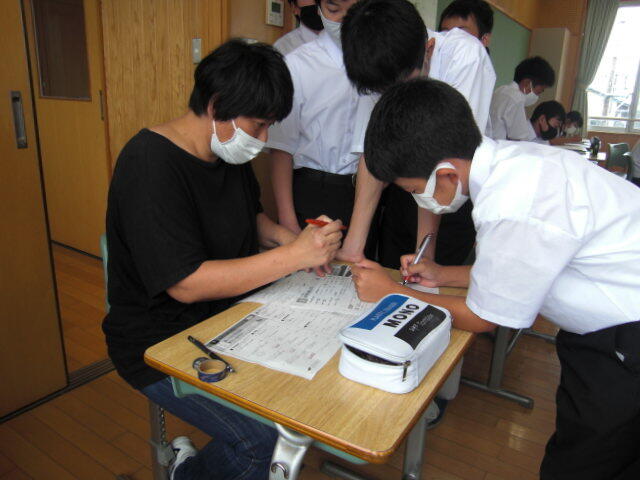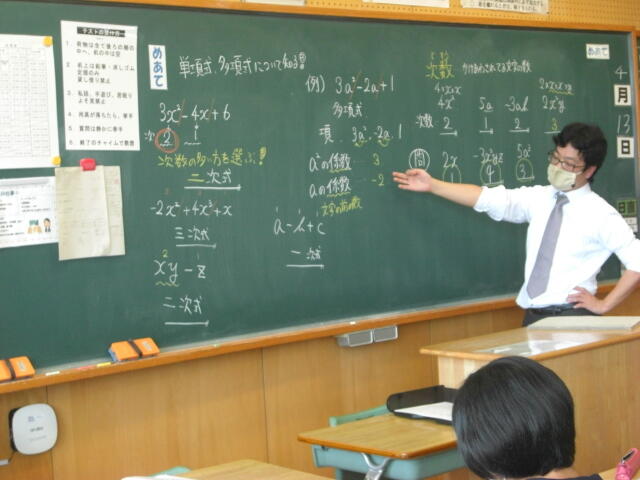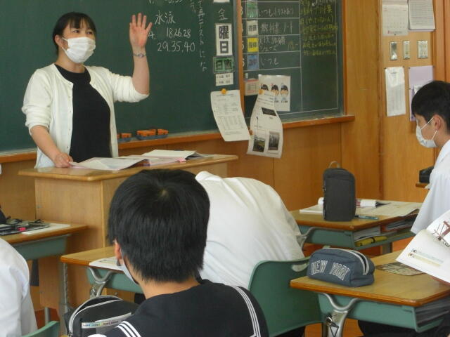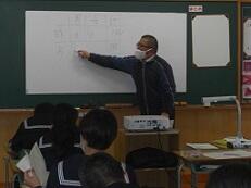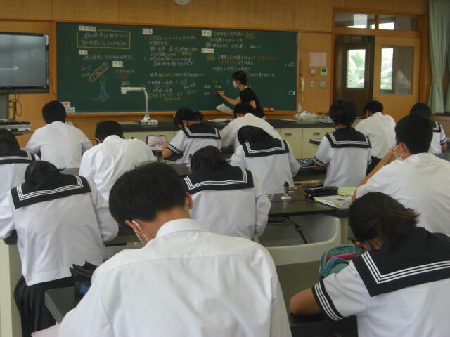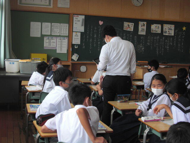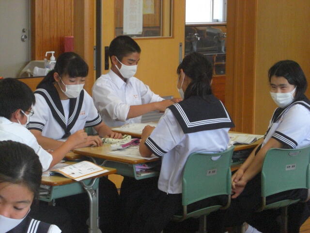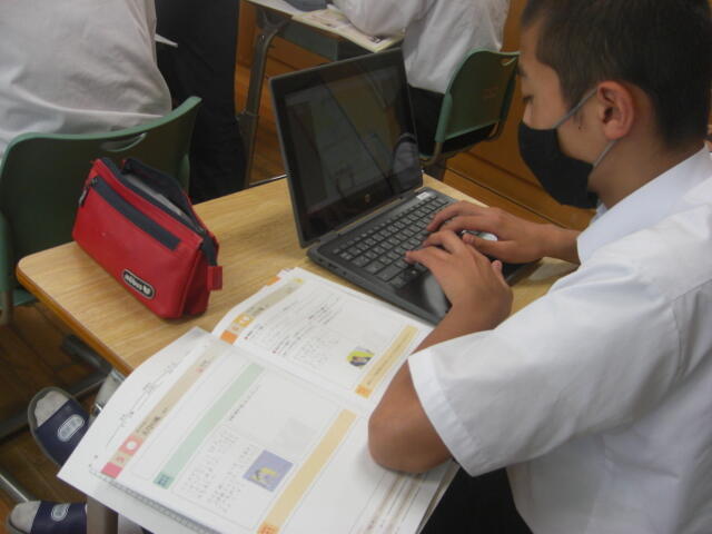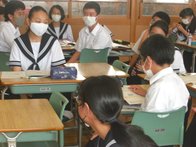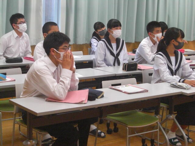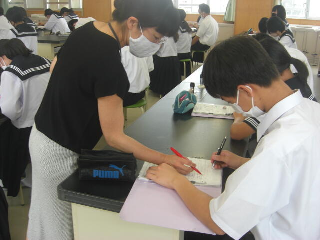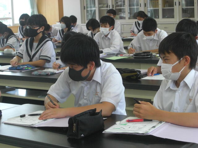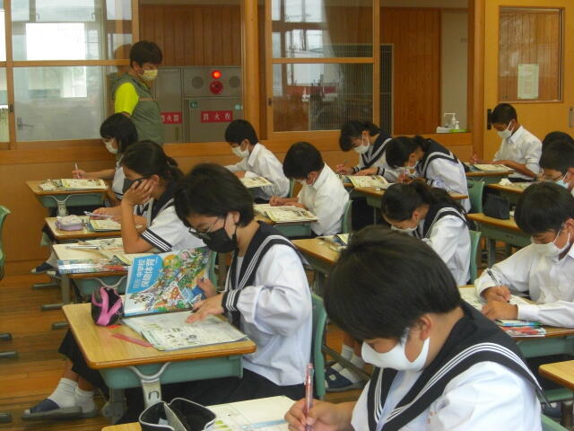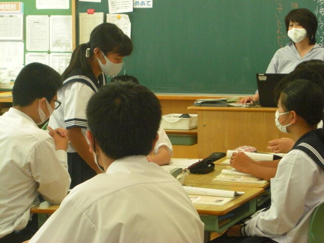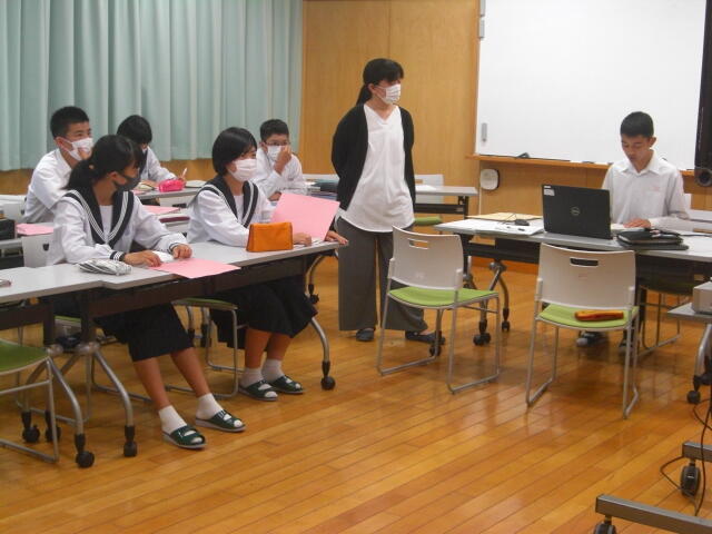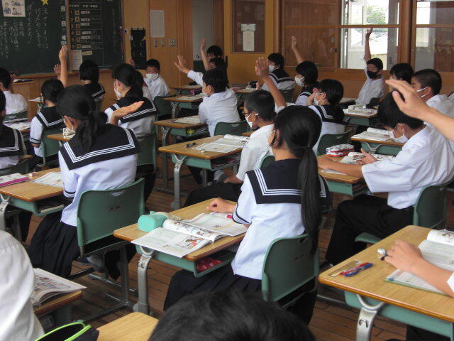 1・2年生は、23日(水)から期末テストですから、1週間前となりました。1年生にとっては、初めての定期テストです。1年3組の数学では、練習問題を速く正しく解くことを目標にして、みんなが一生懸命に問題に向き合っていました。本年度は、町教育委員会から特別支援教育支援員を配置していただいており、都合がつく場合には授業のサポート(ここでは、丸付け)もしてくださっています。
