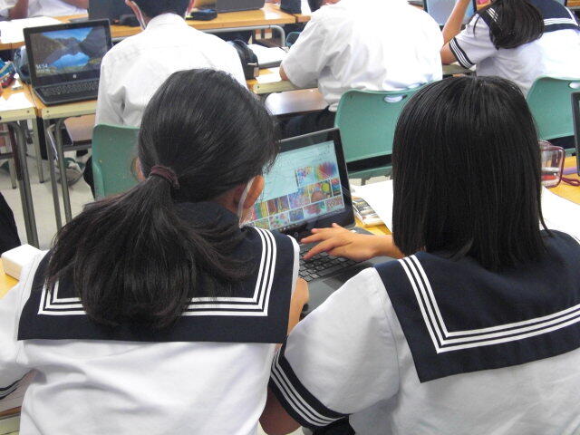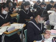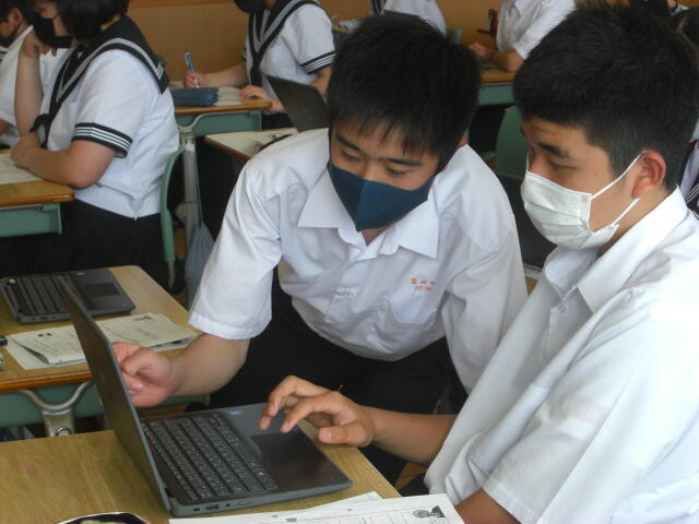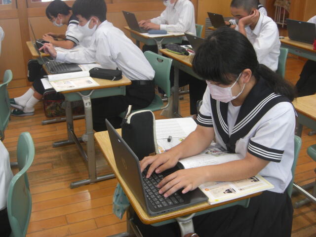 キャリア教育として、1年生がインターネットを使い、仕事調べを行いました。将来の自分の仕事をまだ決めていない生徒もいるため、今回は「○○に関する仕事」や「興味をもった仕事」など、幅広く仕事や職業を調べました。生徒は楽しそうに調べ、プリントに記入していました。