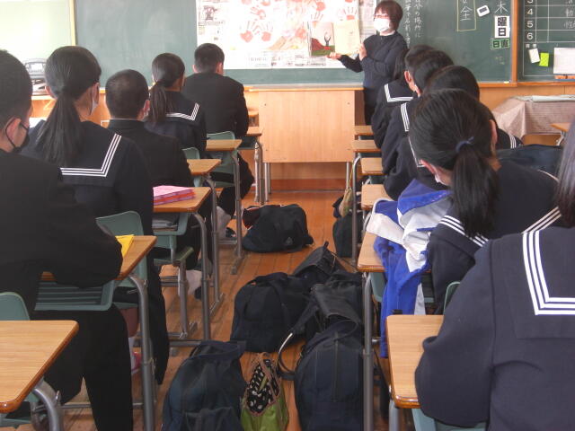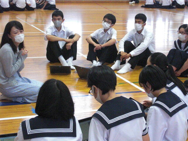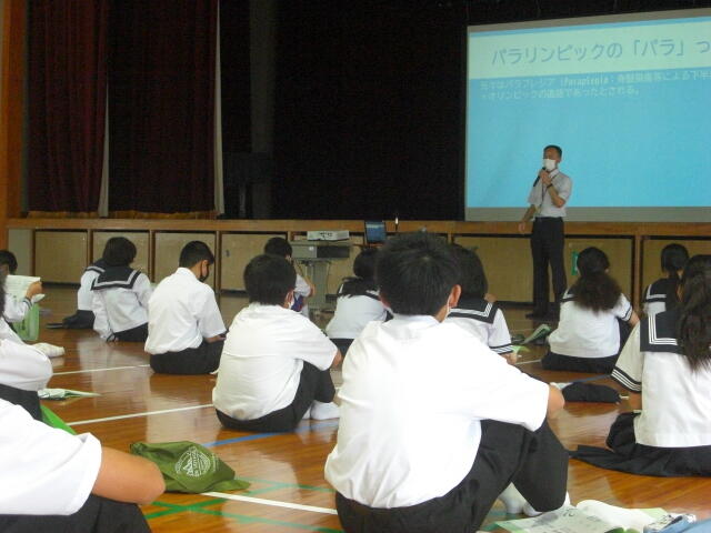町のご厚意で、順天堂大学スポーツ健康科学部助教の野口亜弥さんにおいでいただき、1・2年生を対象にして「LGBTQ・自分らしく生きること」という演題で講演をしていただきました。野口さんは、プロサッカー選手としてご活躍の後、スポーツ庁国際課勤務等のご経験もある方です。町内の他の中学校にはオンラインで配信されました。