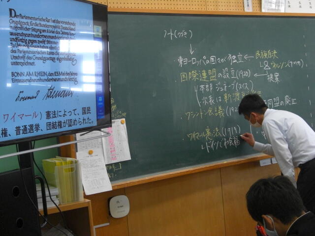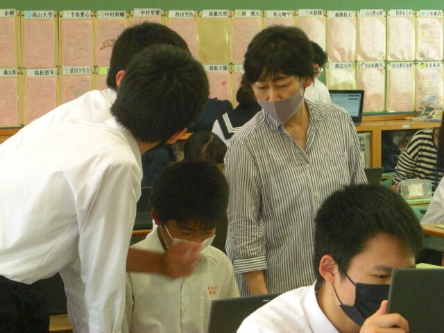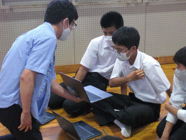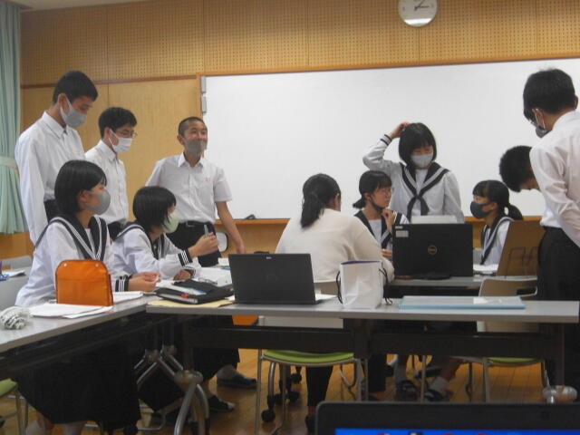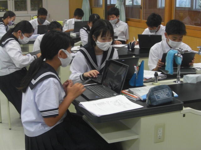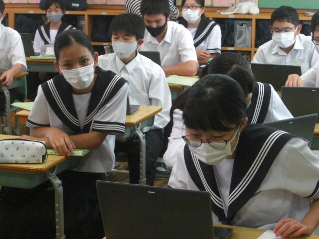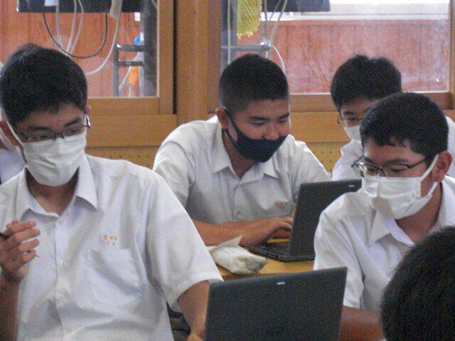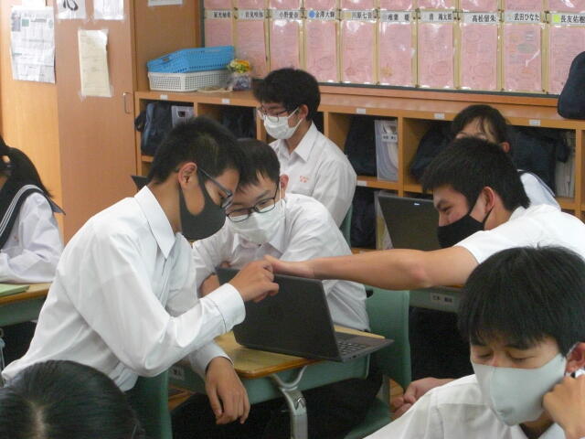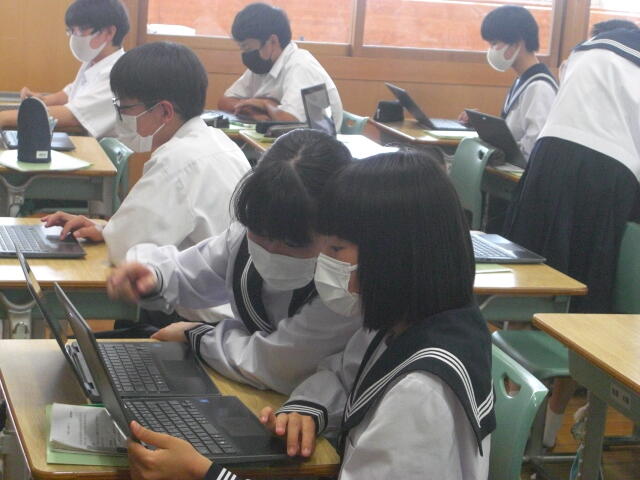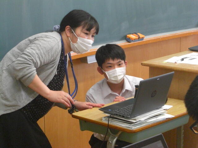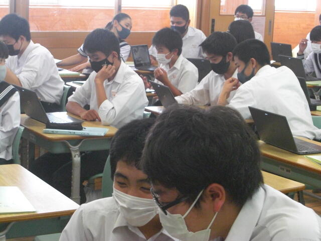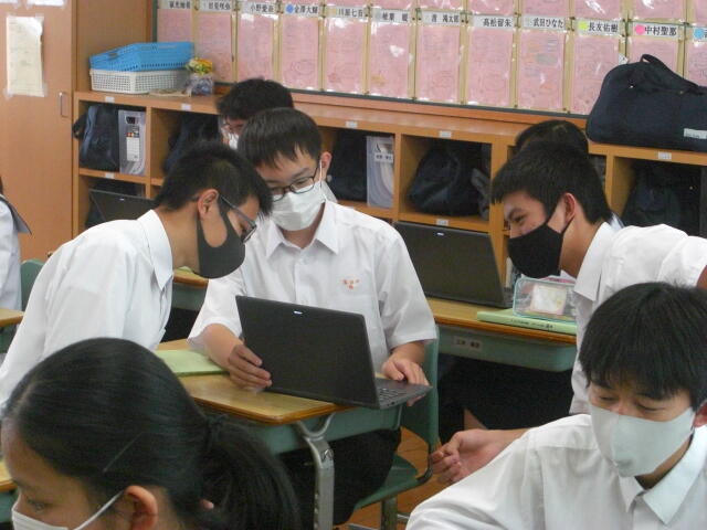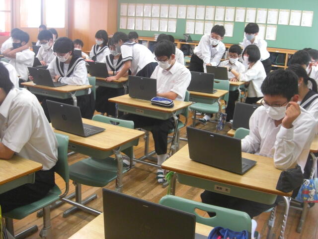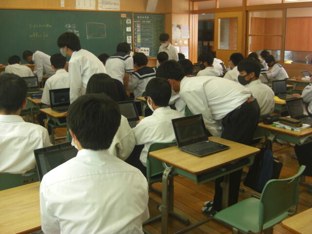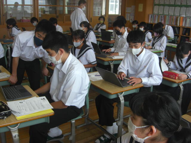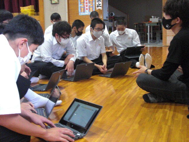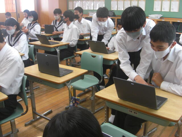 3年生は、タブレット上で先生や生徒同士が会話などをできる機能(チームス)が使えるように、セッティングと試運転を行いました。予期せぬハプニングが起こって試行錯誤という場面もあります。そこで教え合いが生まれたり、得意な生徒が推測しながら解決してくれて活躍したりと、思わぬ効果も生まれました。タブレット活用も少しずつ前進しています。