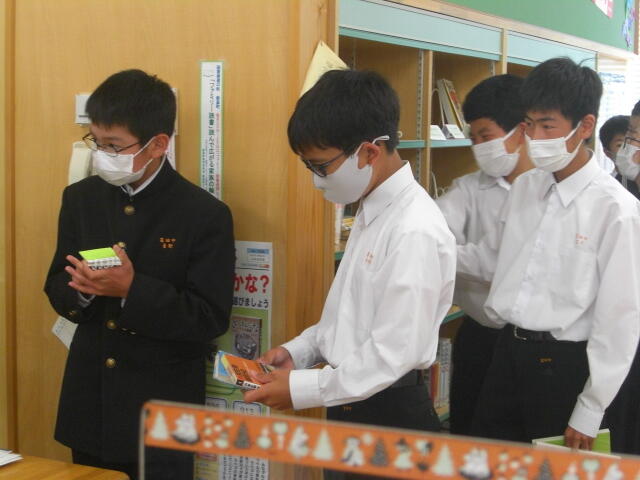 生徒の読書への関心を高めるために、昨日、今日の2日間、昼休みに「クリスマスお話会」を開催し、多くの生徒が図書室を訪れました。今回は、絵本の読み聞かせを図書係の生徒が担当し、吹奏楽部の生徒が楽器を演奏しました。