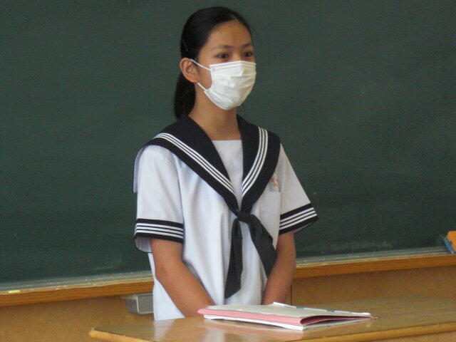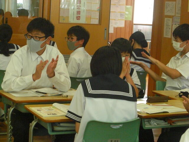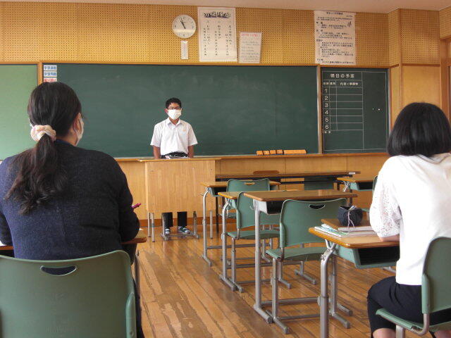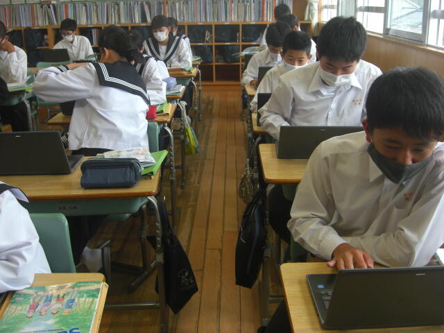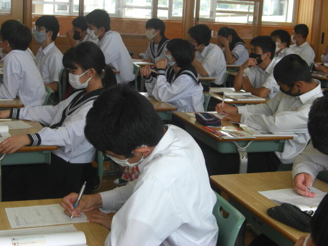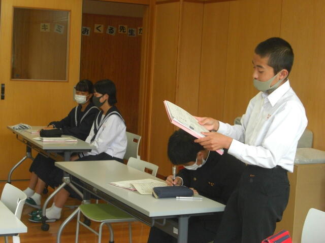 3年生が英語の暗唱テストを行っています。2学期に実施される児湯地区中学生英語暗唱弁論大会に向けて、校内のオーディションも兼ねています。