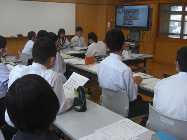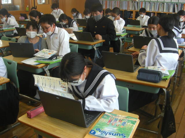 2年生の英語は、学年全体を3コースに分けて少人数指導を行っています。今日の1校時の授業の様子です。「魅力を感じるコマーシャルをグループで協力して発表してみよう」というねらいです。「英語を使うこと、話せること」にチャレンジです。
