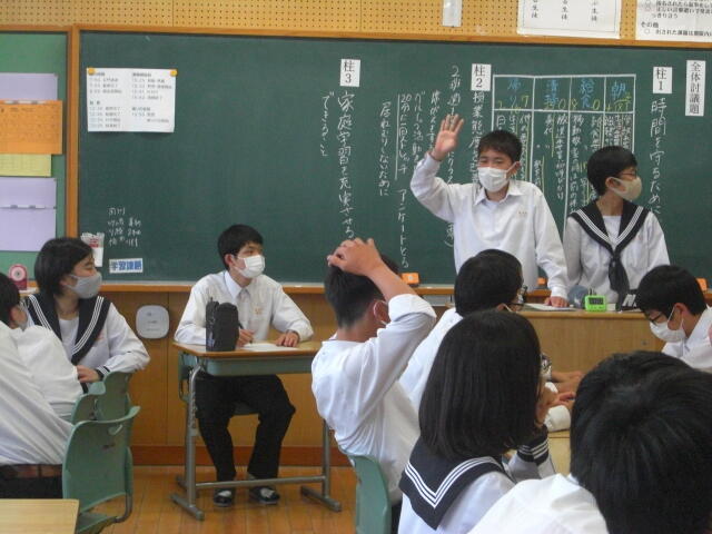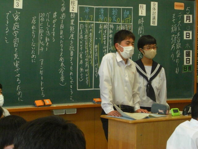 今月下旬(3年生は修学旅行後)の期末テスト に向けて、「リレー宅習」を行うことになりました。「家庭学習の充実」は、生徒総会の協議題にもなっていましたので、生徒会学習委員会の取組としても位置づけます。各学級で5つのグループをつくり、その日の当番の人が自分のグループの宅習ノートを使って宅習をします。翌日は次の人にノートをリレーしていくというものです。宅習のモチベーションアップや宅習方法の参考になることを期待しています。詳しくは、各学級からのお知らせをご確認ください。